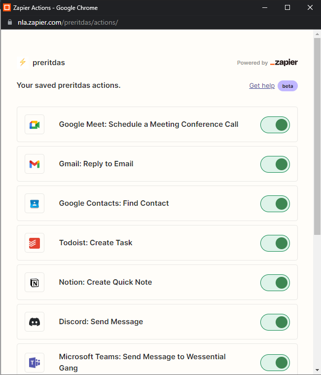 After the initial setup, to change the tools Jeeves has access to (add more, modify configurations, remove tools), visit [nla.zapier.com/preritdas/actions](https://nla.zapier.com/preritdas/actions).&#x20;